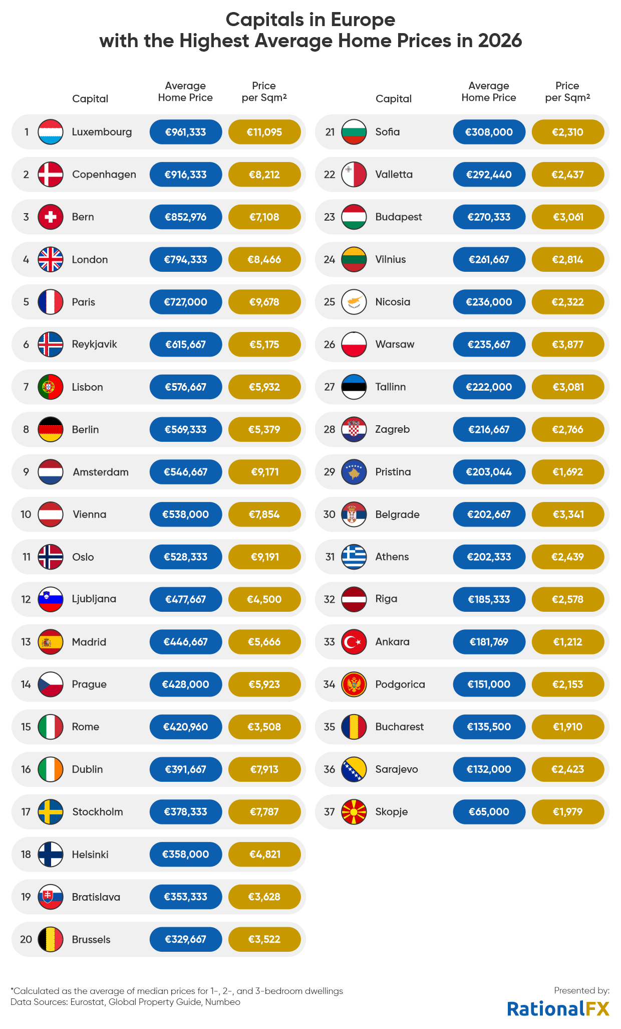- Kalleimad pealinnad: Keskmiselt kõige kallimad kodud asuvad Luxembourgis ja Kopenhaagenis, kus hinnad ületavad 900 000 eurot. Ruutmeetrihinna poolest on esikohal Luxembourg (11 095 €), millele järgnevad Pariis (8 212 €) ja Oslo (7 108 €).