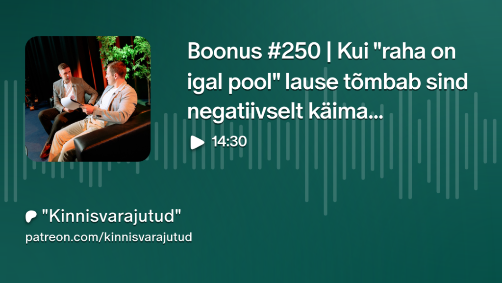 “Kinnisvarajutud” podcasti boonusosas #250 räägivad Algis ja Siim rahast ja täpsemalt laenurahast. Alustavate investorite jaoks on üks kõige enam käima tõmbvamaid lauseid see, et “raha on igal pool”. Kus see raha siis on ning kuidas sellele ligi pääseda? Kui “raha on igal pool” lause tõmbab sind negatiivselt käima, siis see boonusosa on täpselt sinu jaoks! Sest tegelikult on asi väga lihtne ning selles episoodis selgubki tõde!