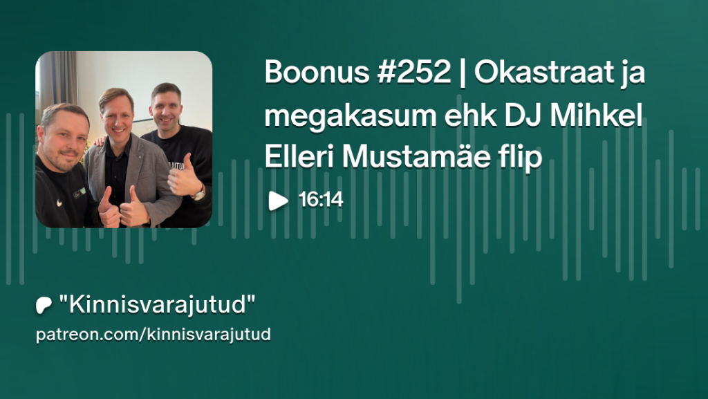 “Kinnisvarajutud” podcasti boonusosas #252 on meil külas meelelahutusettevõtja ja kinnisvarainvestor Mihkel Eller, kellega räägime ühest tema tähelepanuväärsest flipitehingust. Juttu tuleb ühest Mustamäe 2-toalisest korterist, millega õnnestus ühest okastraadiintsidendist vaatamata teenida lühikese ajaga üle 20 000 euro.